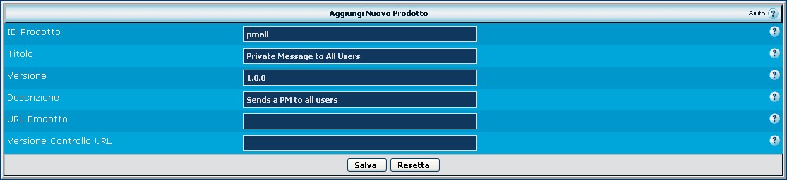 Dopo il salvataggio troviamo la base del nostro prodotto nella lista assieme a vBulletin. Il prodotto in sé non fa nulla, ma raggruppa l'insieme di plugin e definisce alcune caratteristiche globali, quali ad esempio l'ID univoco per il forum (pmall), titolo e descrizione. Prodotti avanzati possono contenere anche procedure di aggiornamento e modifiche al database, che in questo caso non sono necessarie. Inoltre si tratta di un prodotto che dovrebbe anche funzionare in vBulletin 3.8, per cui non abbiamo impostato alcun limite di versione.
