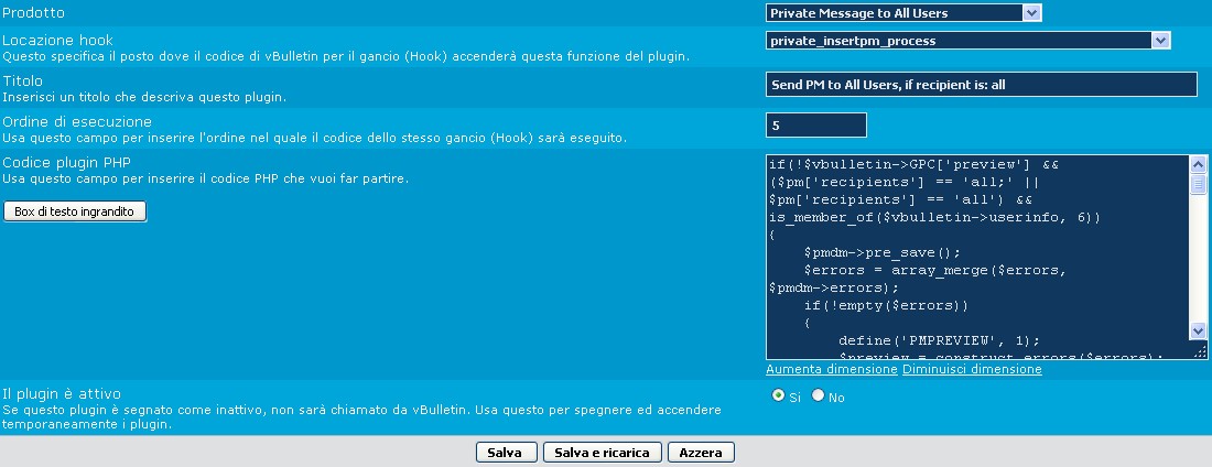 Ora passiamo alla creazione del plugin che effettua l'invio del messaggio privato a tutti gli utenti, se il mittente appartiene al gruppo degli amministratori e se il destinatario è "all":