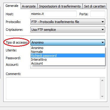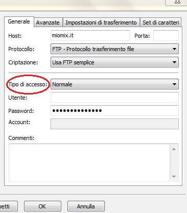 Nel 'protocollo' e nella 'criptazione' lasciateli così, invece nel 'tipo di accesso', cambiatelo e mettetelo 'normale'.