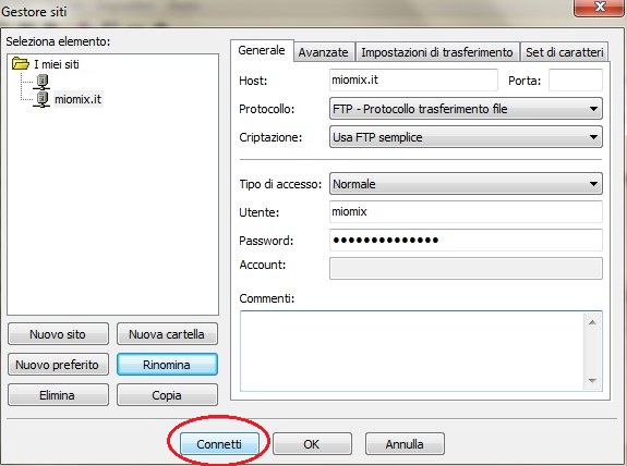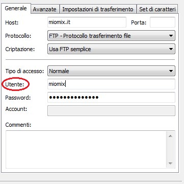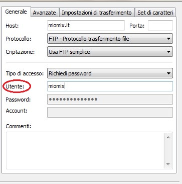 Nell'utente mettete il nome del sito (es. miomix).
