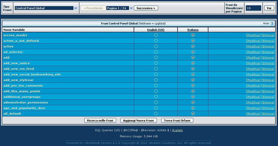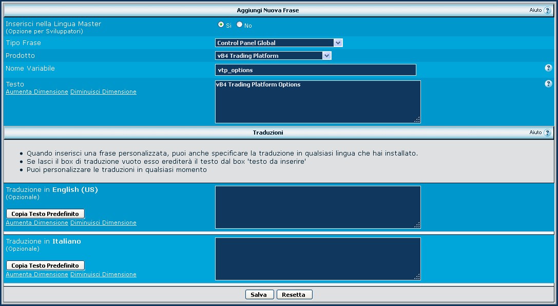 Poi andiamo in Lingue & Frasi, Gestione frasi, e selezioniamo dalla lista Tipo frase "Control Panel Global":