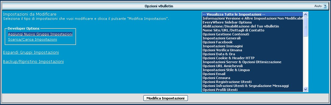 Per poter creare nuove opzioni è necessario abilitare la modalità debug nel pannello di controllo ACP. Dopo aver aumentato la versione del prodotto alla 1.0.2, andiamo nelle opzioni di vBulletin. Al riquadro generale clicchiamo sulla voce qui evidenziata, "Aggiungi Nuovo Gruppo Impostazioni":