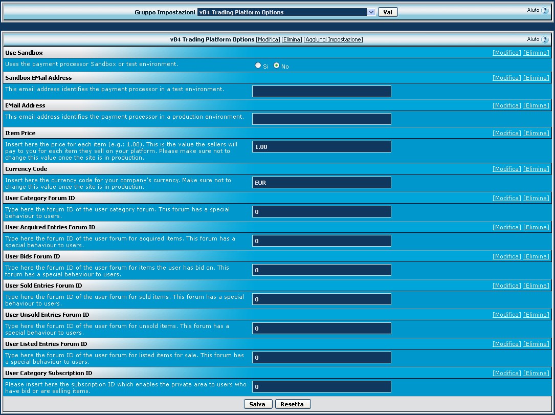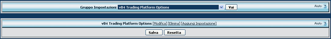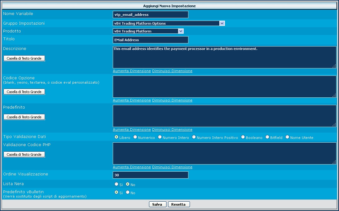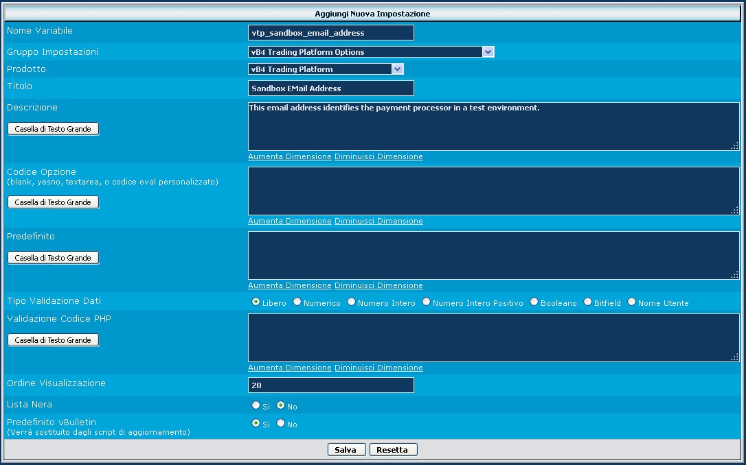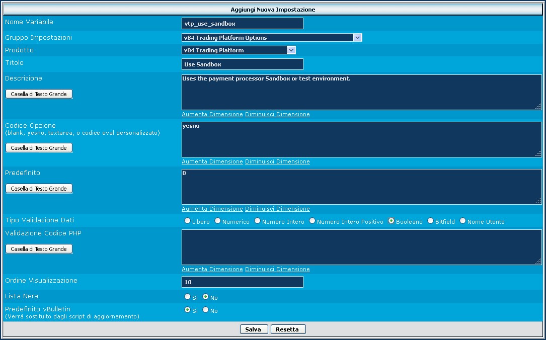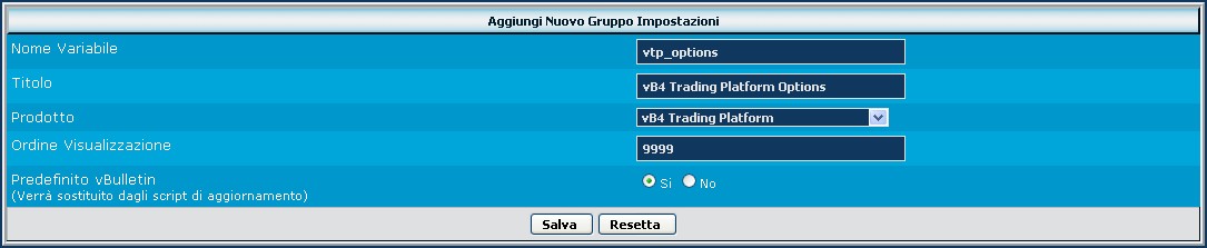 Come vediamo, la variabile si chiama vtp_options, il titolo vB4 Trading Platform Options del prodotto che realizziamo e l'ordine di visualizzazione impostato a 9999, per trovarlo poi alla fine delle opzioni standard di vbulletin. Il valore Predefinito vBulletin è normalmente impostato a Sì.