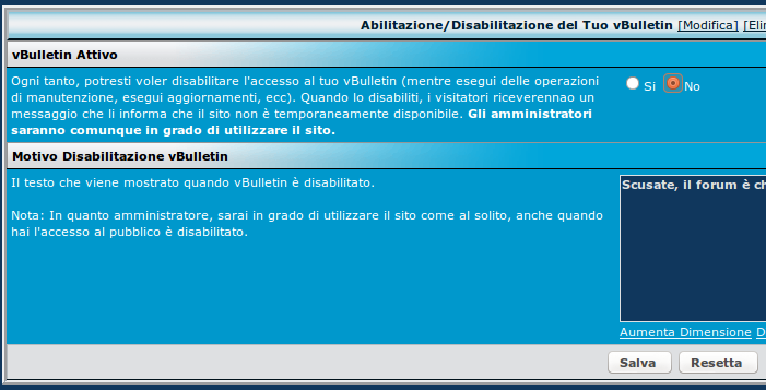 Dopo l'invio dei file è necessario andare nel pannello di controllo ACP e importare l'aggiunta. Quasi tutte le aggiunte possono essere installate a forum attivo, ma si dovrebbe sempre chiuderlo al pubblico per evitare temporanei problemi per via di installazioni ancora incomplete (Opzioni - Abilitazione/Disabilitazione del Tuo vBulletin):