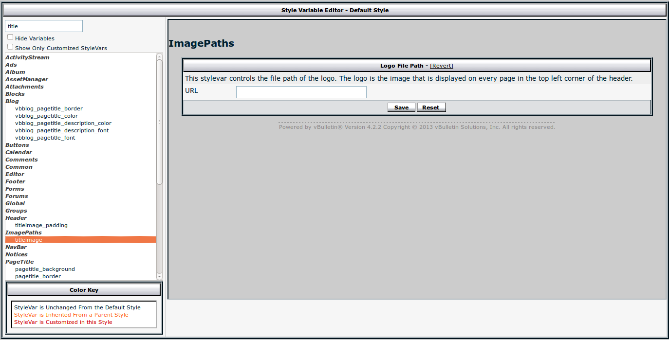 Per rimuovere il logo predefinito degli stili a livello superiore (Default Style e Default Mobile Style), dobbiamo eliminare il riferimento all'immgine nelle Style Varibles: titleimage. Dato che non si può salvare uno spazio vuoto, ci mettiamo uno spazio con la barra spaziatrice: