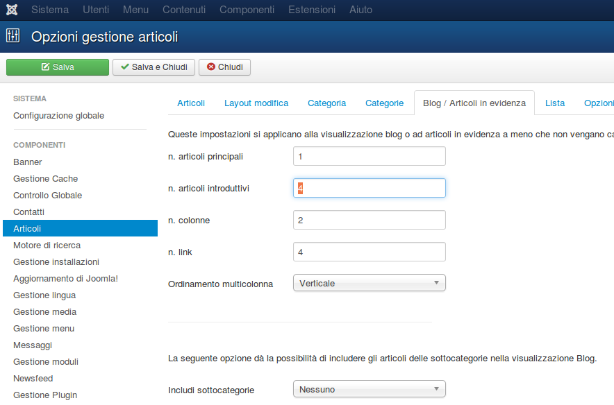 Ci sono infatti diversi posti dove viene impostato l'ordine degli articoli in evidenza. Il primo è in Configurazione globale - Articoli - Blog / Articoli in evidenza, dove si definisce l'ordine all'interno delle categorie, ad esempio: