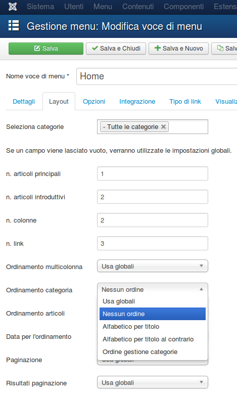 Sotto la voce Ordinamento categoria si seleziona Nessun ordine:
