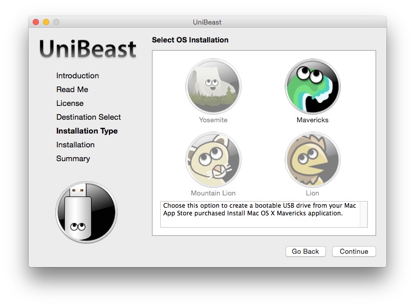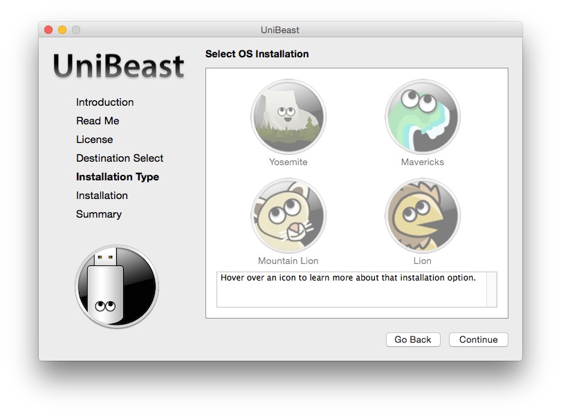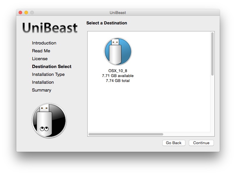 Finalmente possiamo tornare a Unibeast per completare la copia del sistema operativo. Si preme sul pulsante Rescan e voilà, possiamo scegliere la penna USB come destinazione. Qualora si trovano altre partizioni disponbili, bisogna fare molta attenzione per non cancellare dati importanti.