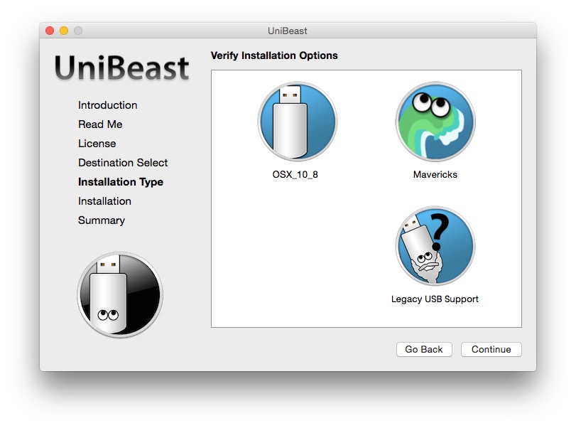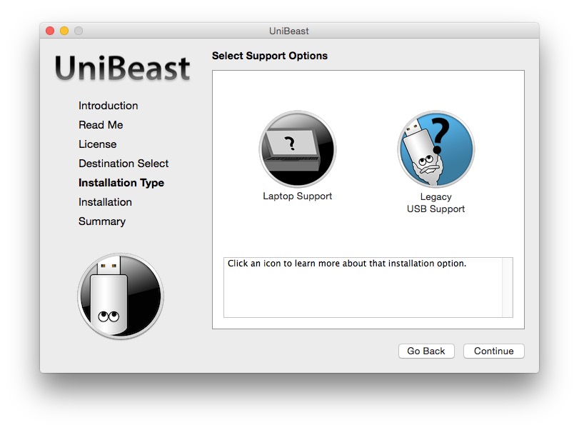 Si clicca quindi sul sistema da installare e si va avanti. Per impostare l'installazione per un PC, si seleziona Legacy USB Support, altrimenti Laptop Support. Potenzialmente è possibile selezionare più di una opzione, ma bisogna scegliere una sola.