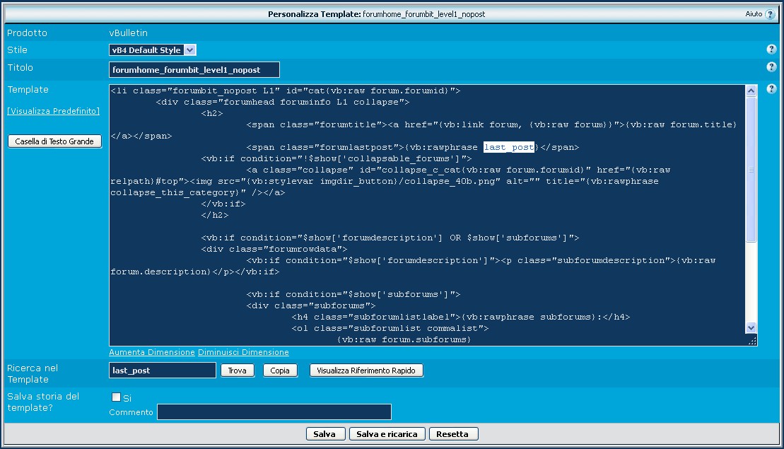 Dove troveremo una lista di template che contiene la frase ricercata. Con un po' di intuito e tentativi troveremo poi il template giusto: