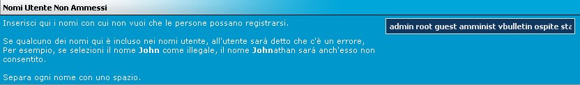 Per impedire che un utente si registri con nomi riservati allo staff o simili, vBulletin offre l'opzione Opzioni Registrazione Utente - Nomi Utente Non Ammessi, dove si possono elencare tutti i nomi o frazioni di nomi riservati: