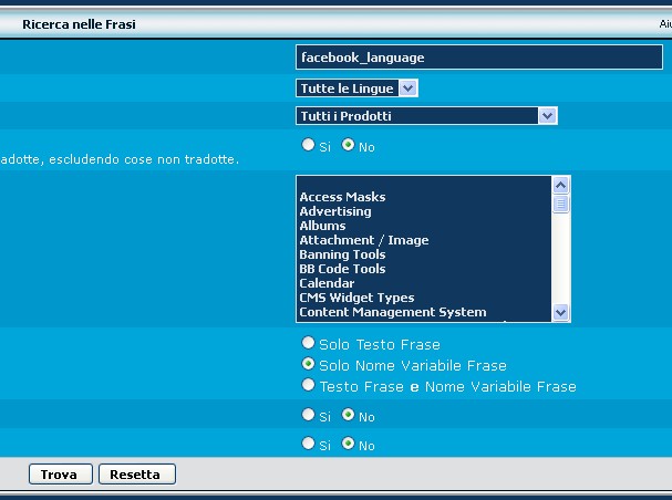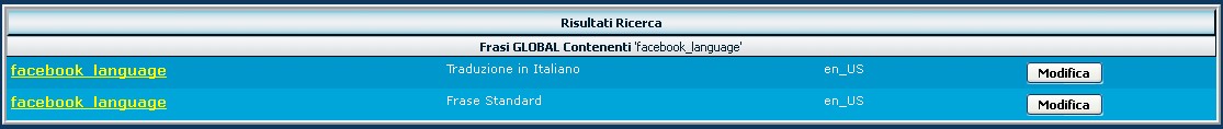 Nella casella di ricerca scriviamo facebook_language e ricerchiamo per Solo Nome Variabile Frase: