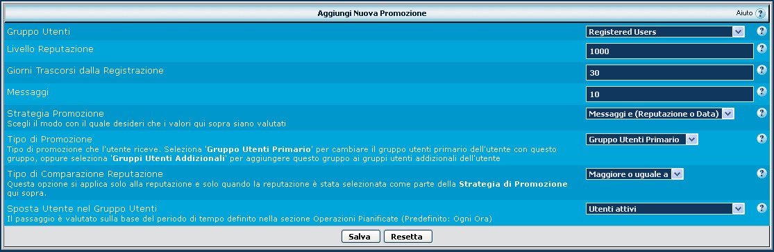 Il criterio qui impostato è la reputazione di 1000, che volutamente non sarà mai raggiunto, un minimo di 30 giorni di iscrizione e un minimo di 10 messaggi. E' anche pressoché l'unica eccezione alla regola dove si spostano gli utenti da un gruppo primario a un altro gruppo primario, anziché aggiungere gruppi secondari: