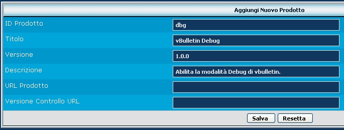Per i prodotti che funzionano soltanto per una versione specifica di vBulletin, suggeriamo di usare un id di prodotto con una sigla specifica, ad esempio dbg4. Nel nostro caso l'utilità funziona su tutte le versioni. In ogni caso, deve essere diversa da qualunque altra sigla usata nel nostro forum e una combinazione di 3 o 4 lettere è più che sufficiente ... non usare termini troppo espliciti per altri motivi tecnici.